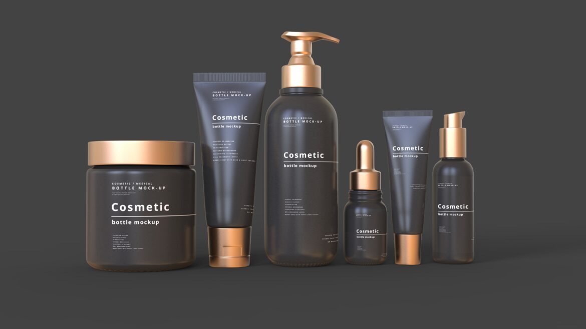 A full set Cosmetic packaging and branding mockup scene.