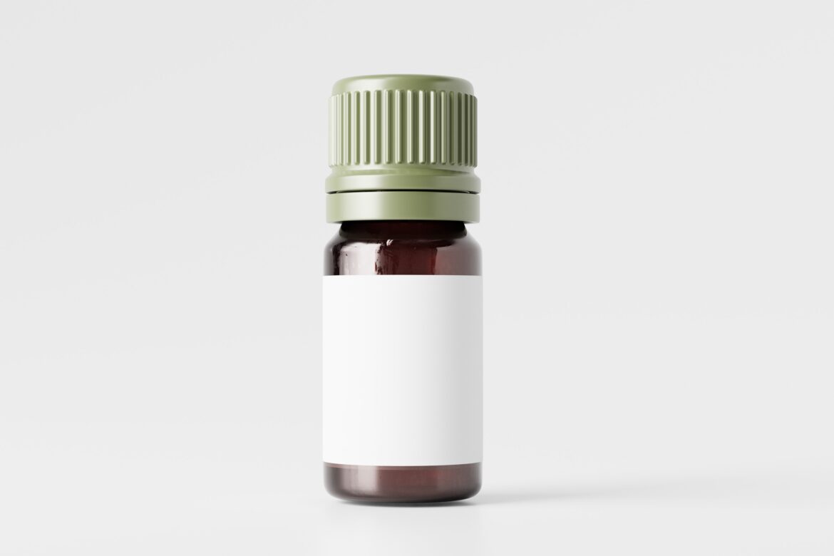 Amber glass medicine bottle with a plastic screw cap. a small bottle commonly used for packaging of products such as medicine, cosmetics, oils etc…