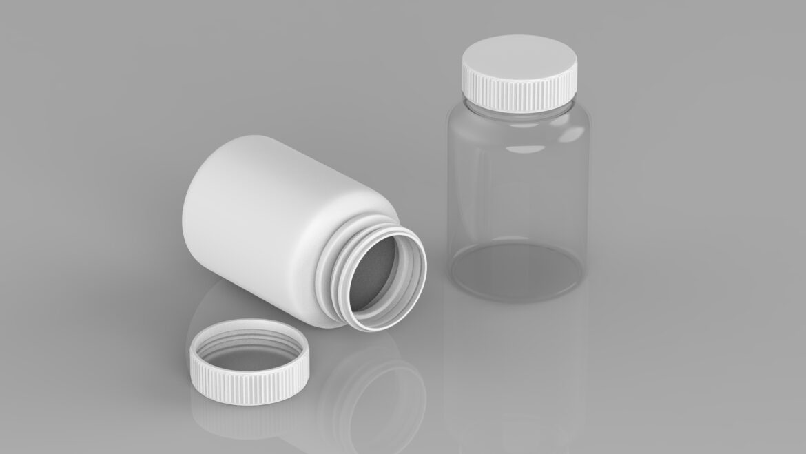 • 2 different types of medicinal bottles. Clear plastic bottle and opaque plastic bottle with lid.