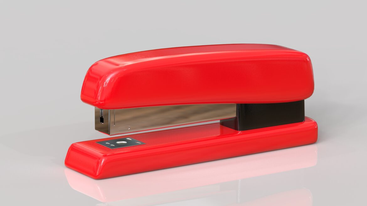 Realist, high-poly stapler for use in business, office, and home environments focused on desk or documents.